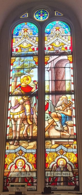 ont été réalisés par des verriers de Tournai. Deux sont dédiés à St Martin. Les autres dans le chœur ont pour thème St Michel terrassant le dragon, l’agonie de Jésus et jardin des Oliviers et la descente de la croix. Dans la nef, ils représentent les apparitions du Sacré Cœur à Marguerite Marie, Ste Jeanne d’Arc et le baptême de Clovis, l’Annonciation, la Nativité et la Résurrection.